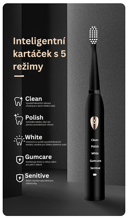 S našou špičkovou kefkou máte k dispozícii 5 režimov pre účinnú starostlivosť o zuby. Zvoľte Clean pre každodenné dôkladné čistenie. Polish zaisťuje intenzívne čistenie a lesk. White je ideálny na bielenie zubov. Gumcare kombinuje čistiaci a citlivý režim. Sensitive je pre citlivé zuby. S našou kefkou môžete ľahko prepínať medzi týmito režimami a zaistiť si tak maximálnu flexibilitu.